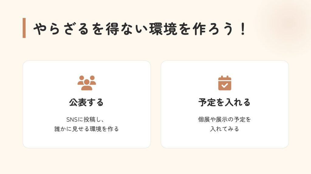 などです。自分の場合は、社会人になってからも制作を続けるために、半年後に個展の予定を入れました。