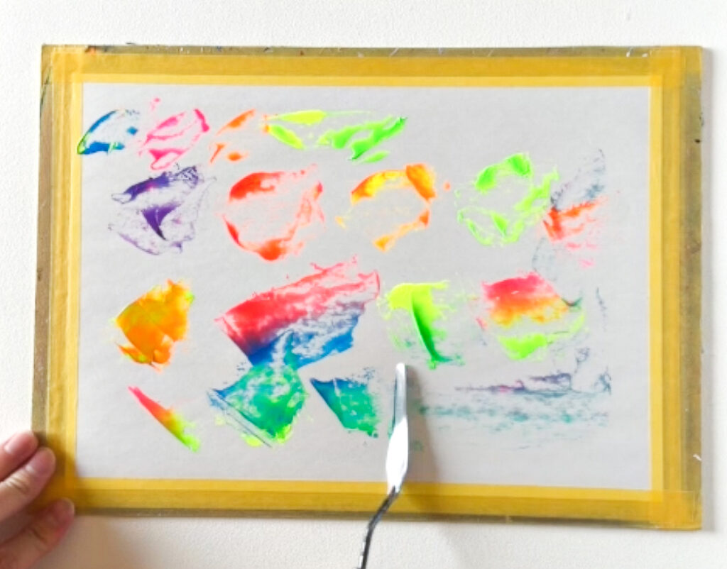 - ペインティングナイフで表面の絵具を大まかに削ぎ取る。
