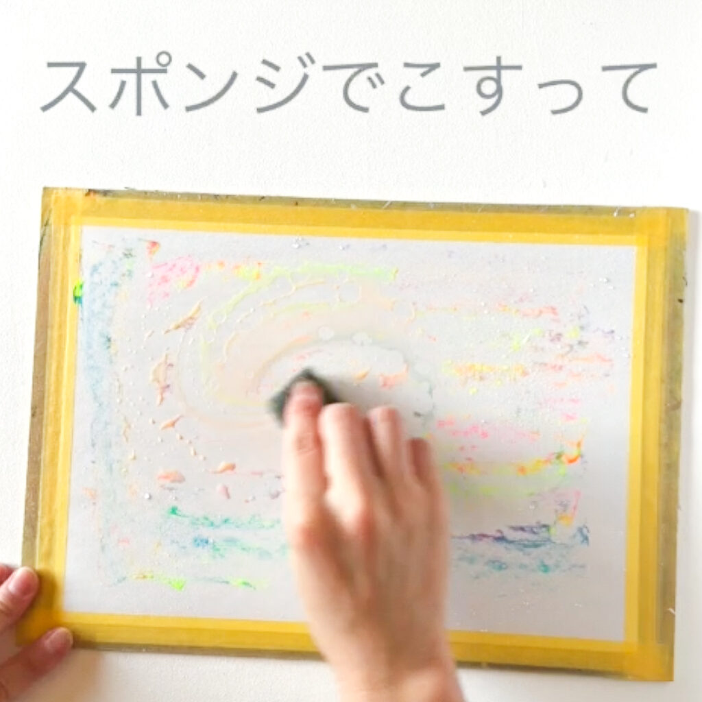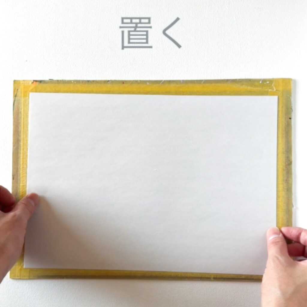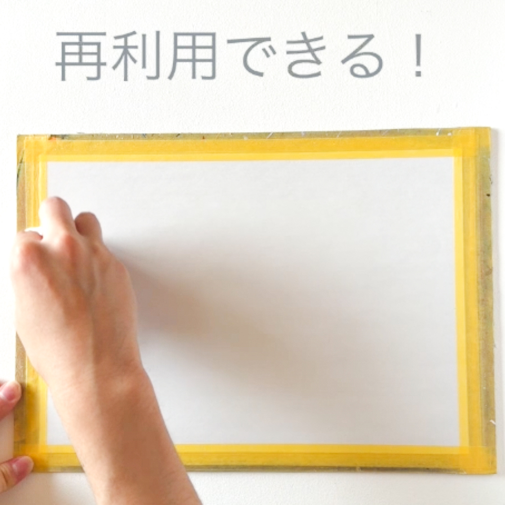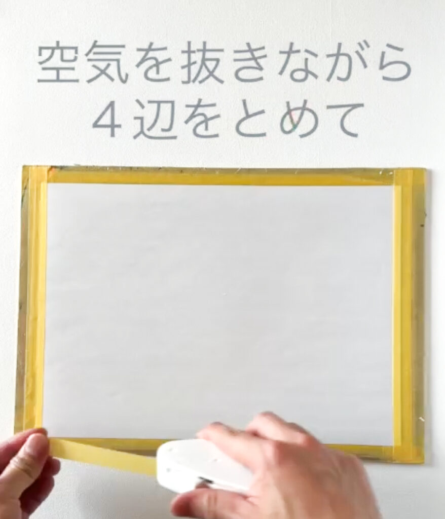 マスキングテープで4辺をとめていきます。中の空気を抜きながら貼るようにするのがポイントです。テープはなんでも大丈夫ですが、粘着が強いタイプの方がしっかり定着すると思います。