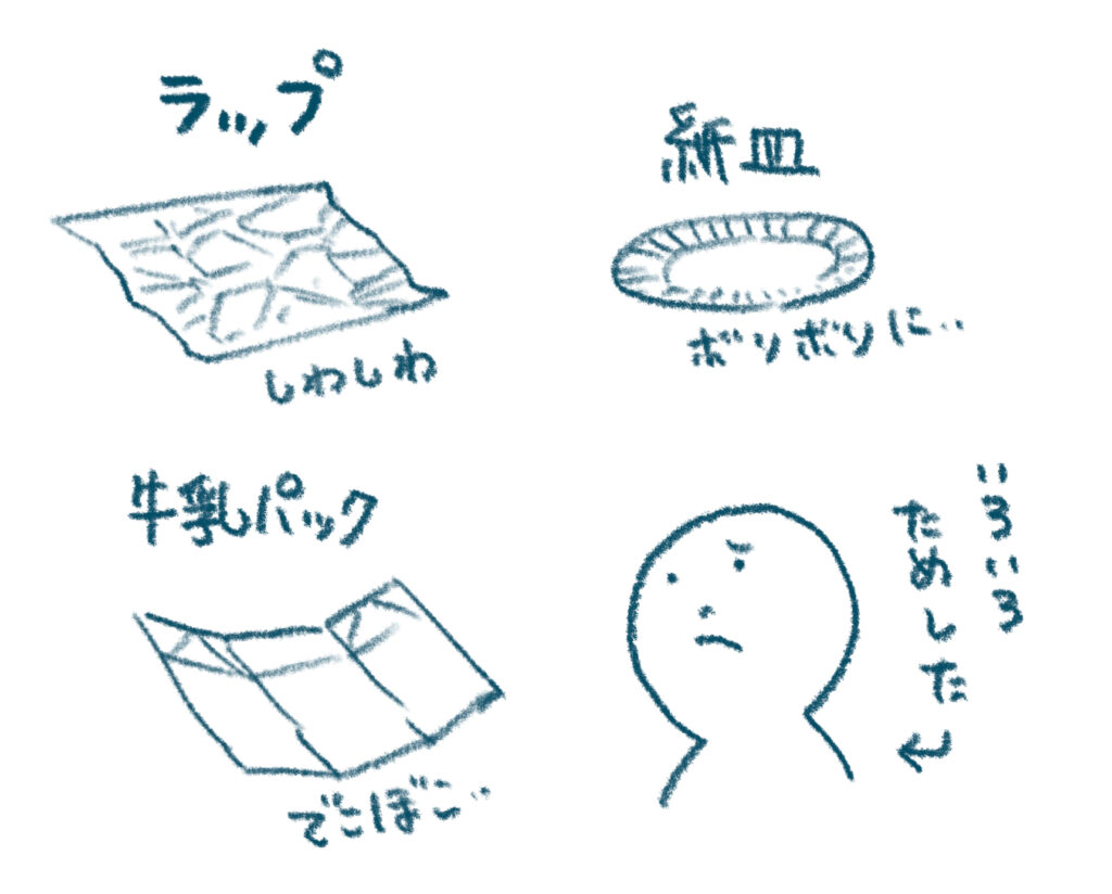 - 牛乳パックを開く:表面の凹凸がナイフの動きを邪魔する。