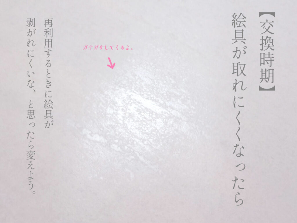 シリコンペーパーは、絵具が取れにくくなるなど、表面のシリコンの効きが悪くなってきたと感じたタイミングで交換しています。